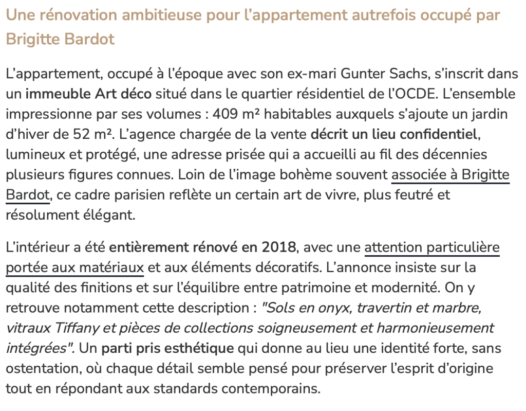 Le Journal de la Maison is a renowned design and interiors magazine in France. They have recently run an interesting article about the stunning apartment in Paris which is the former home of Brigitte Bardot.