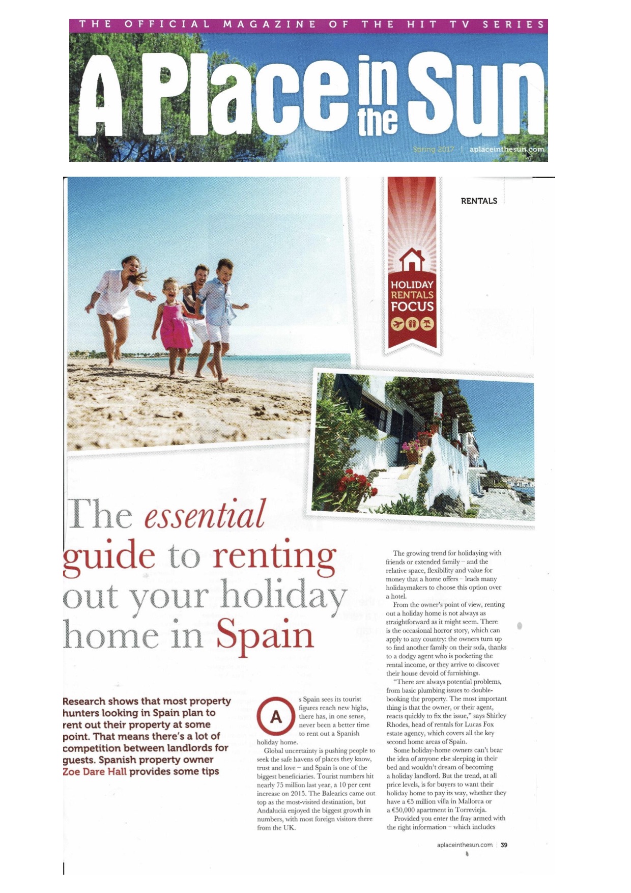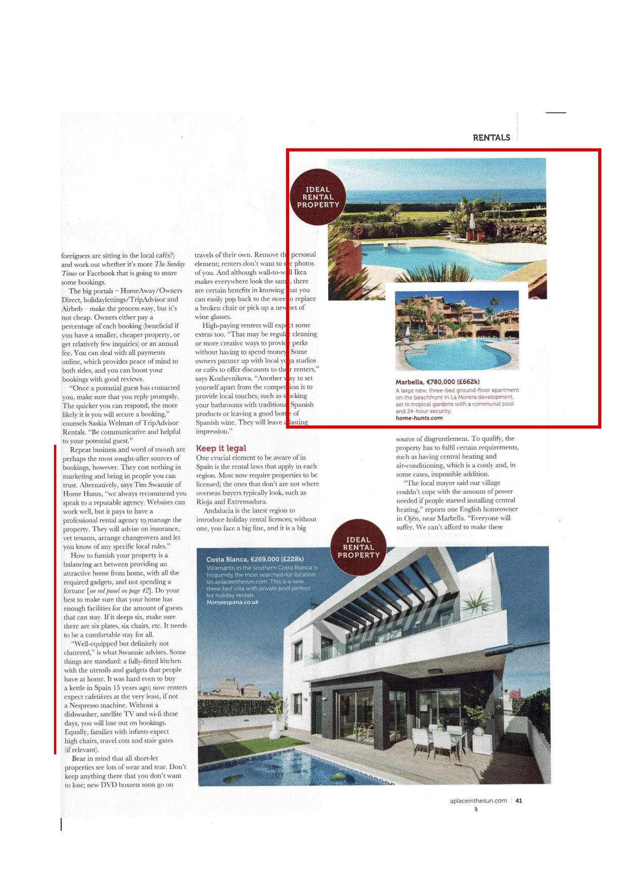A Place in the Sun magazine have run a great article in their latest edition which gives tips to those spanish property owners who wish to rent their property. The article includes comments from Home Hunts such as:
